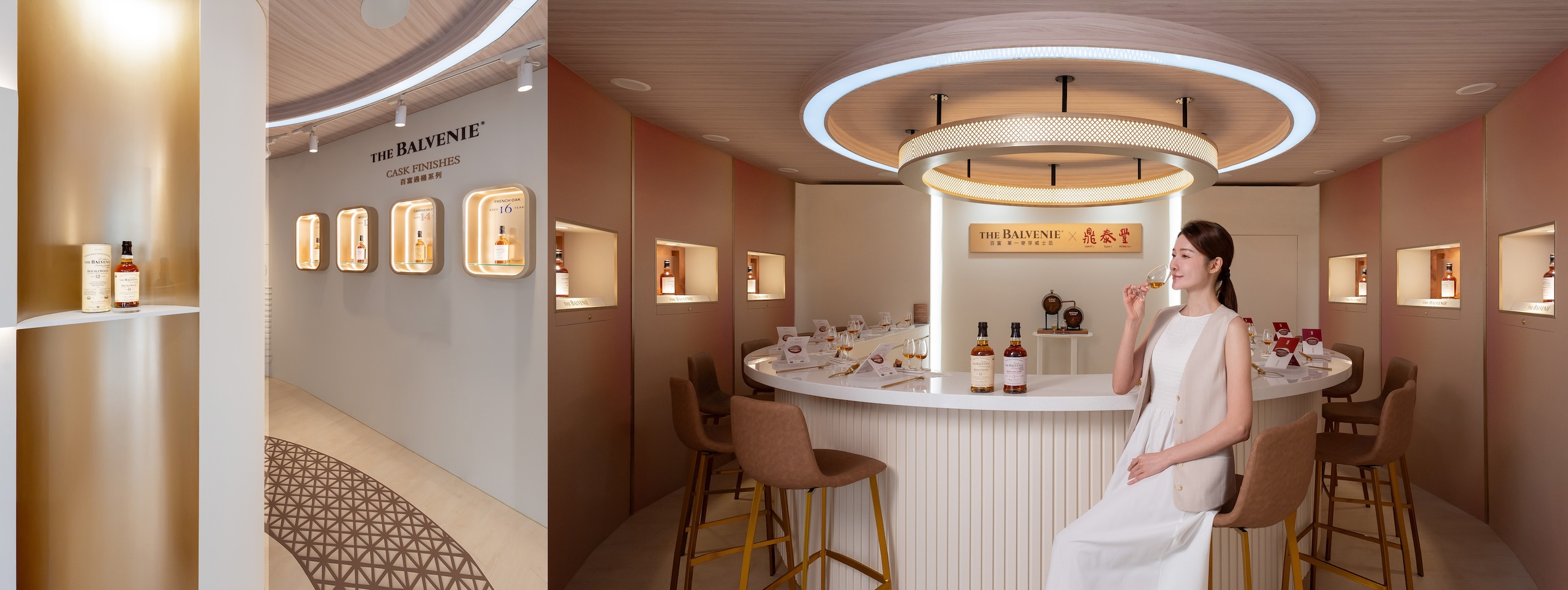 內部以環形品飲吧台為核心,懸掛式光環裝置象徵酒液的層次流動;牆面以凹槽展櫃呈現百富多款酒體的桶型語彙,使展示呈現溫潤而沉靜的美術館氣場。