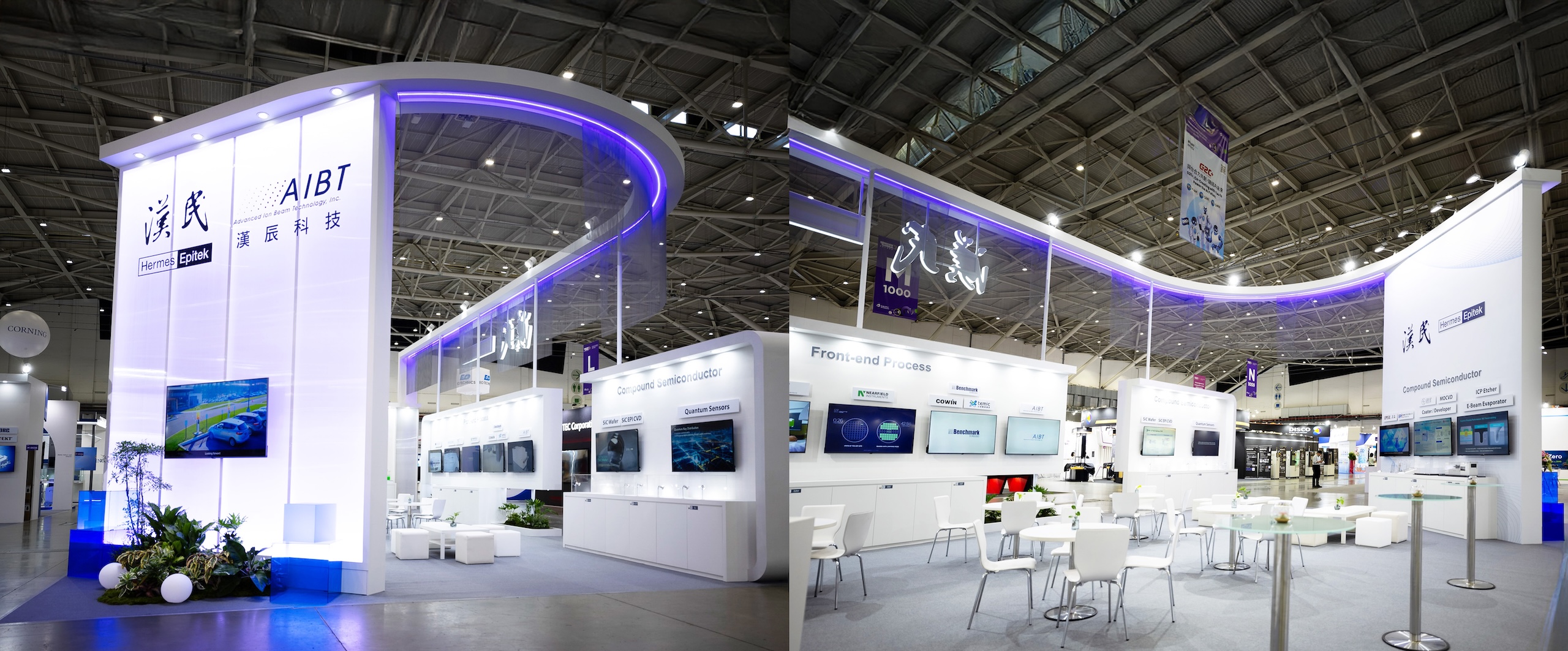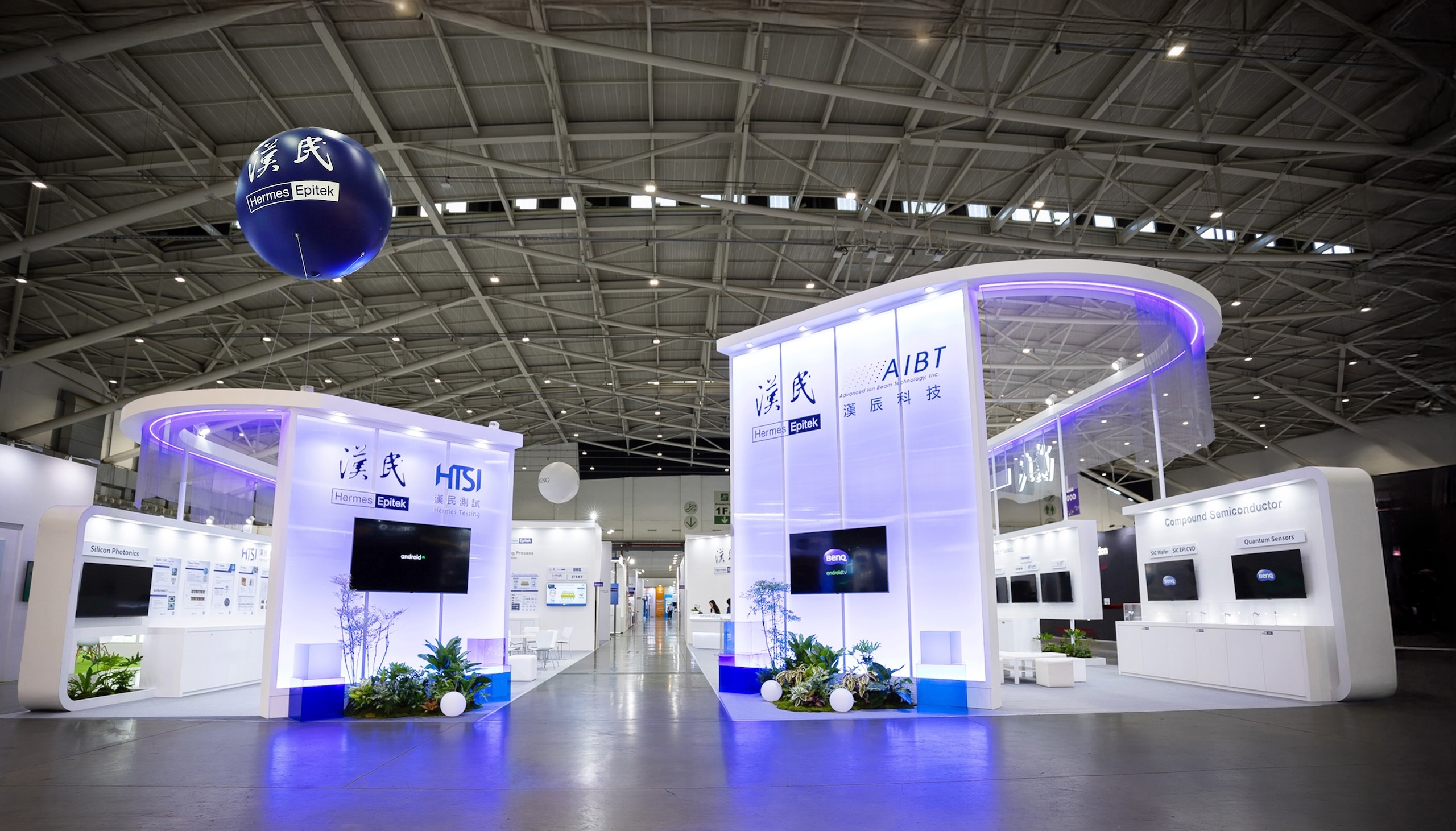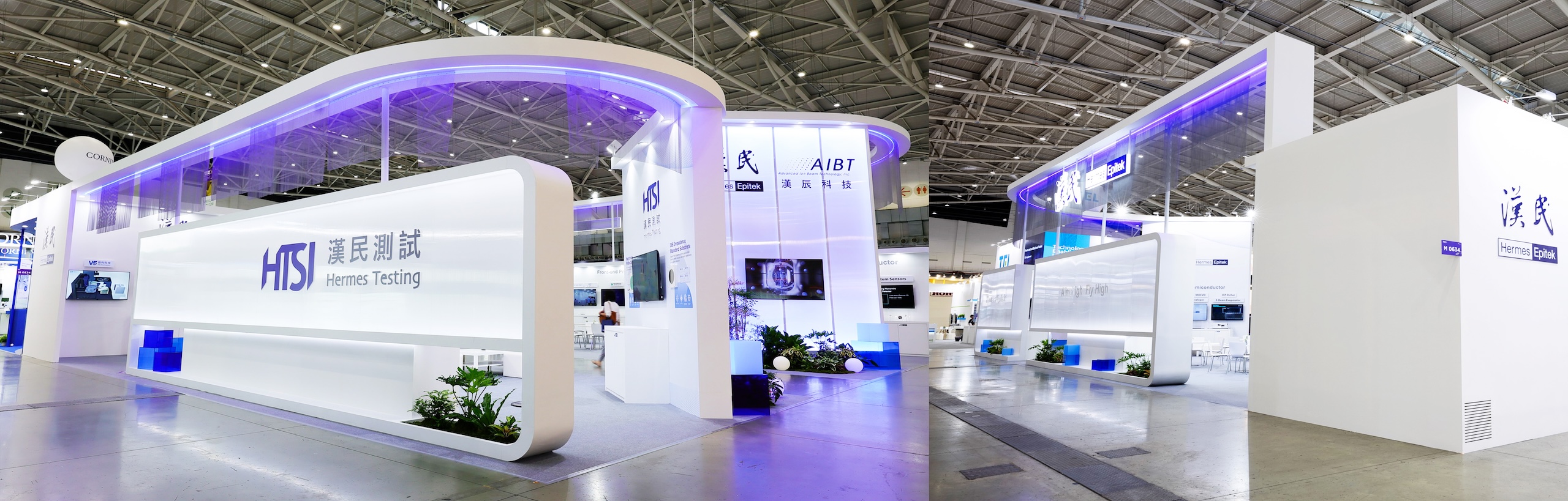 以「Aim High, Fly High」為核心精神,整體展位以半透明建築語彙與流線弧形框架構築出象徵精準與純度的科技場景;外層光帶以冷白與電光紫交疊,強化漢民在前後段製程版圖中的技術張力。入口以高挑立面結合環形光帶,形成具有導入性的視覺門廊,帶領觀者進入晶圓製程的關鍵環節。