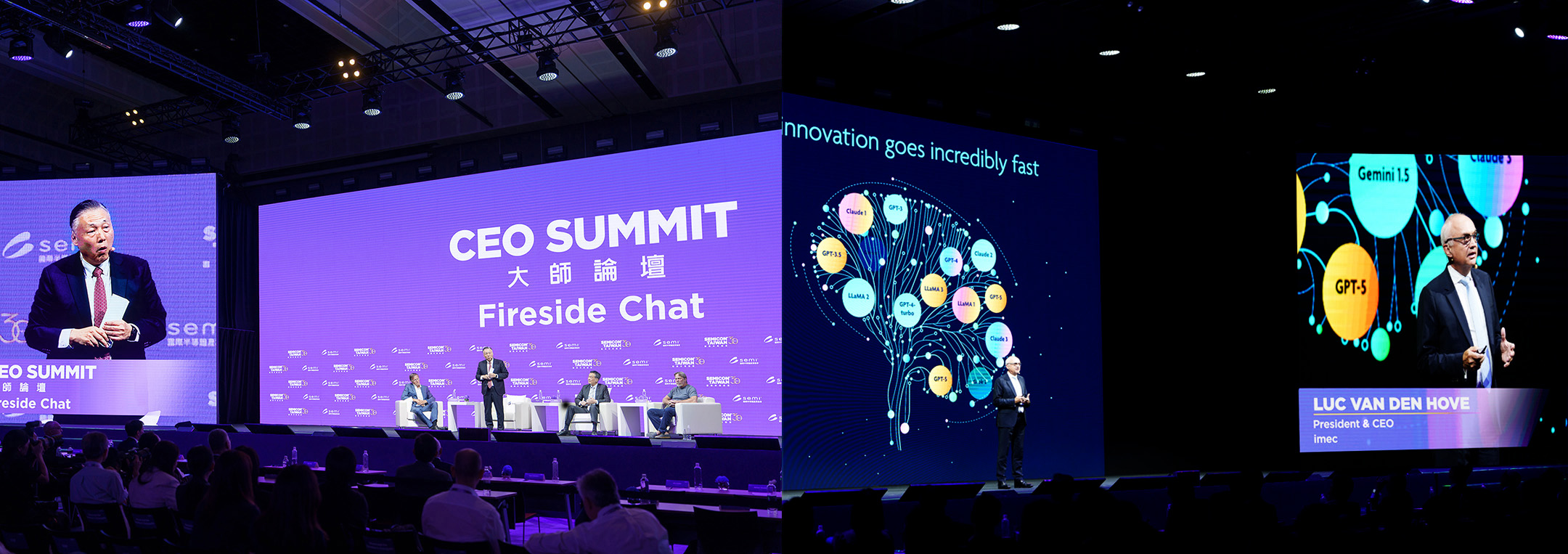 主舞台以超寬巨型 LED 打造多層次資訊介面,從關鍵技術到產業趨勢,以圖像化語彙串連年度論壇、CEO Summit 與國際專題演講,使內容在視覺上更具整合力。