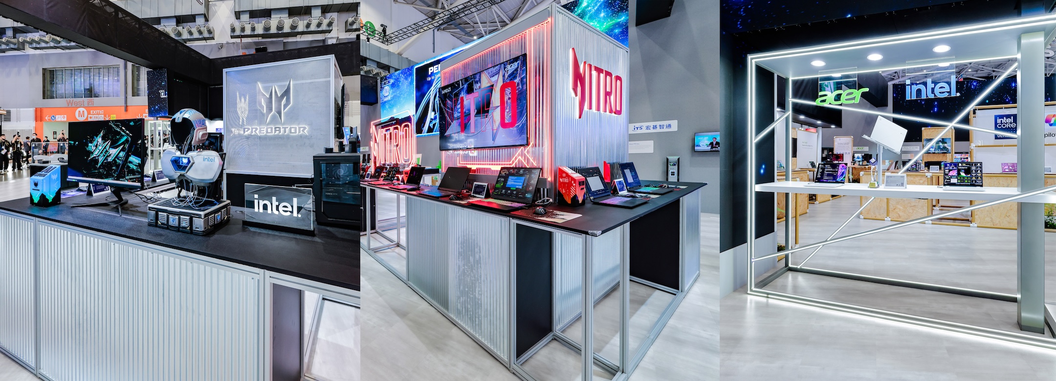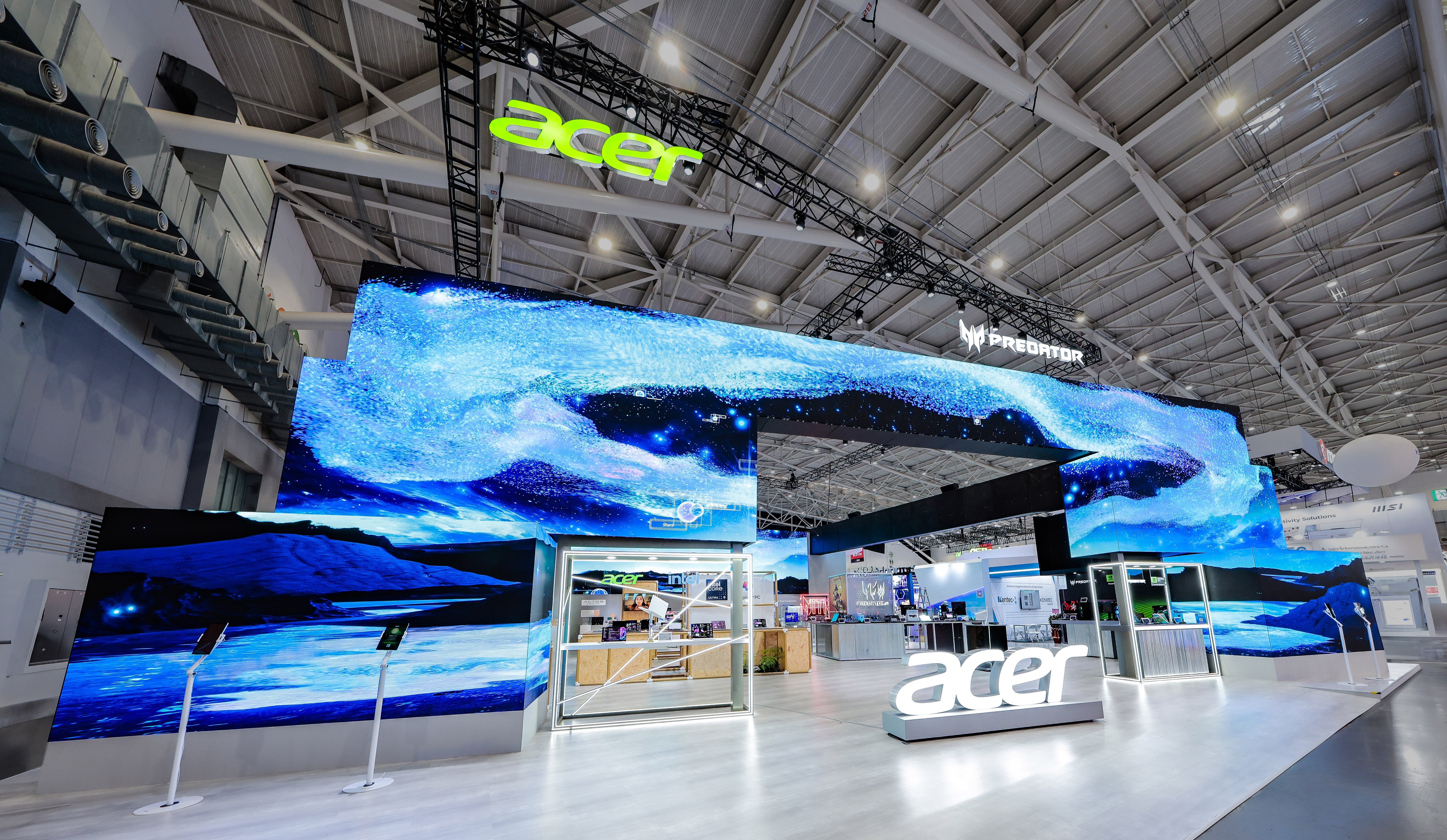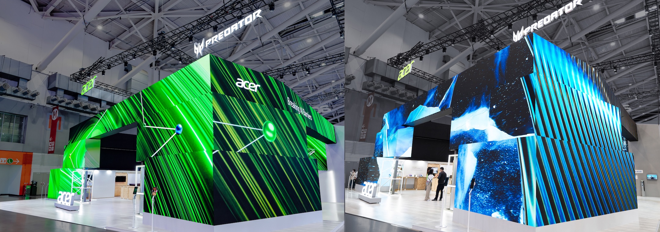 展區設計以「微觀與氣候的美學重構」為概念,營造高聳環繞、開放且具科技感的場域氛圍。大型 LED 屏幕播放微觀氣候變化的主題動畫,融合 Acer 品牌語彙,分別以 acerX 光的轉化、Predator X 星光的脈動與 Nitro X 大地的呼吸 為主題。