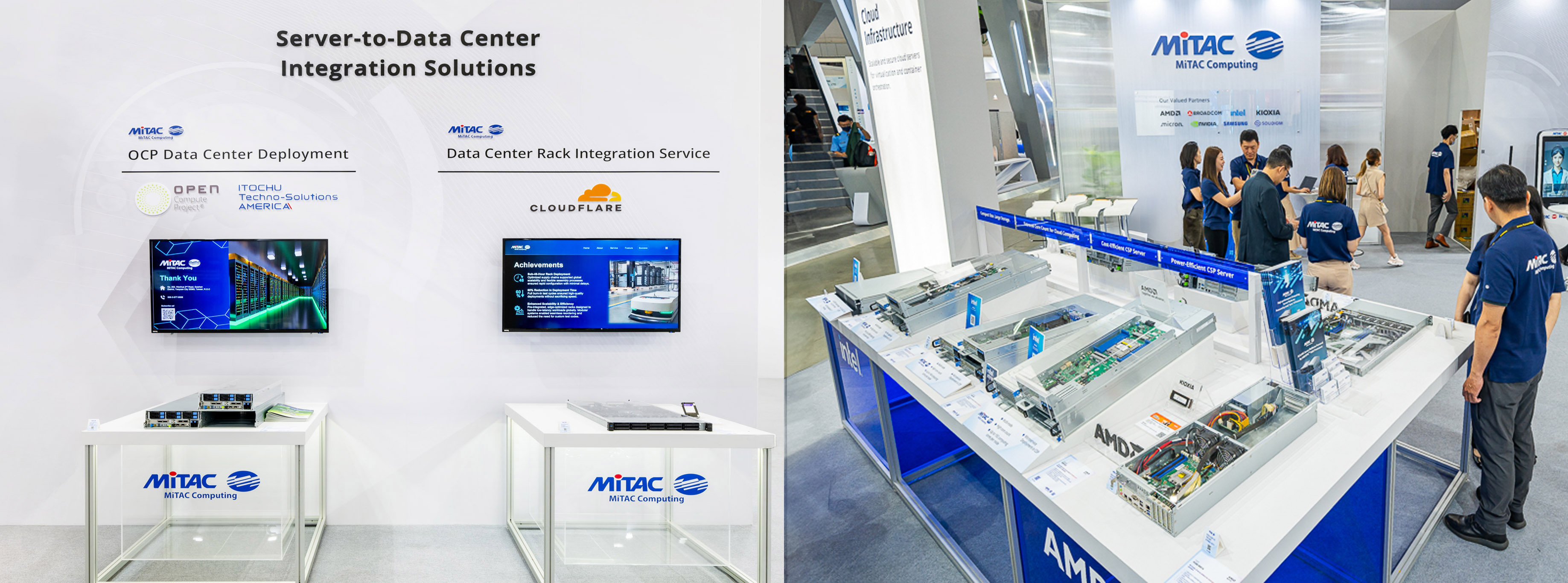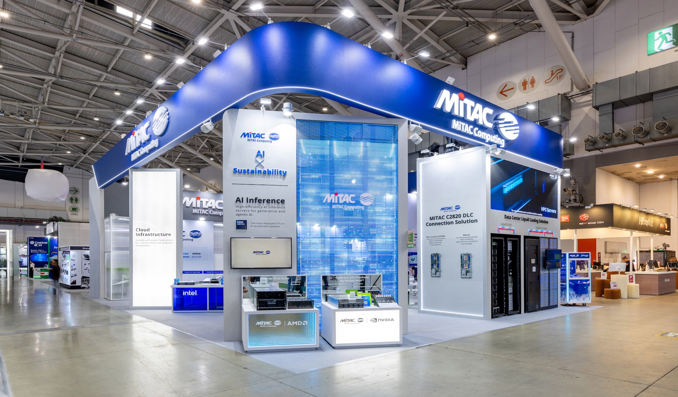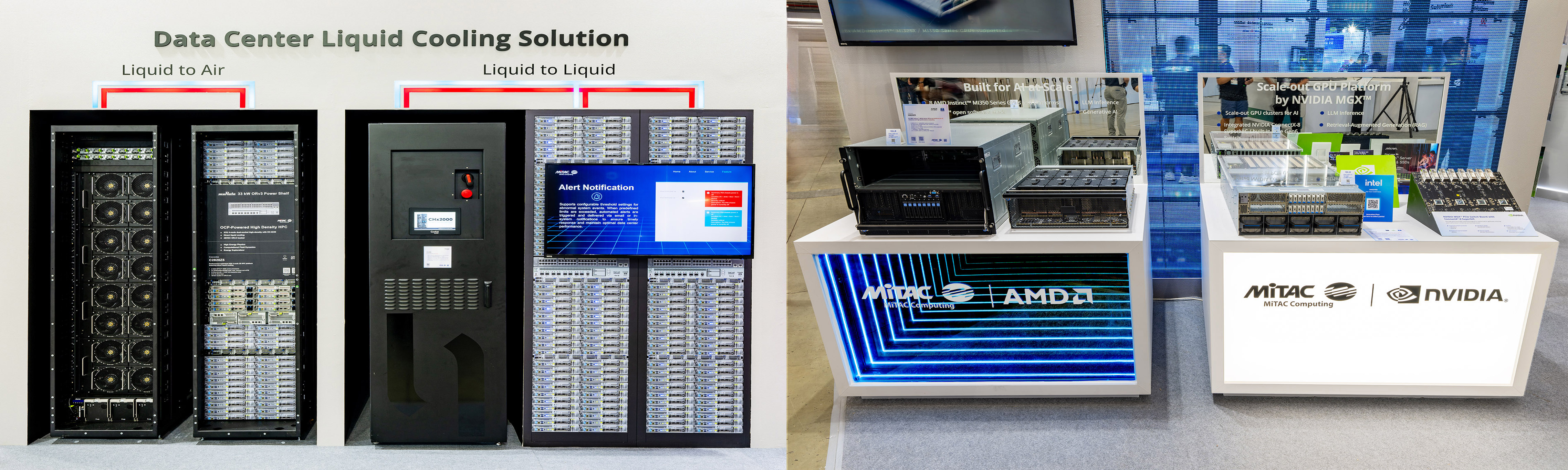 空間以開放式機櫃陳列結構為主軸,清楚劃分伺服器、液冷解決方案與儲存技術展示,搭配清晰標示與模組化配置,突顯 MiTAC 在整合能力與製造能量上的優勢。