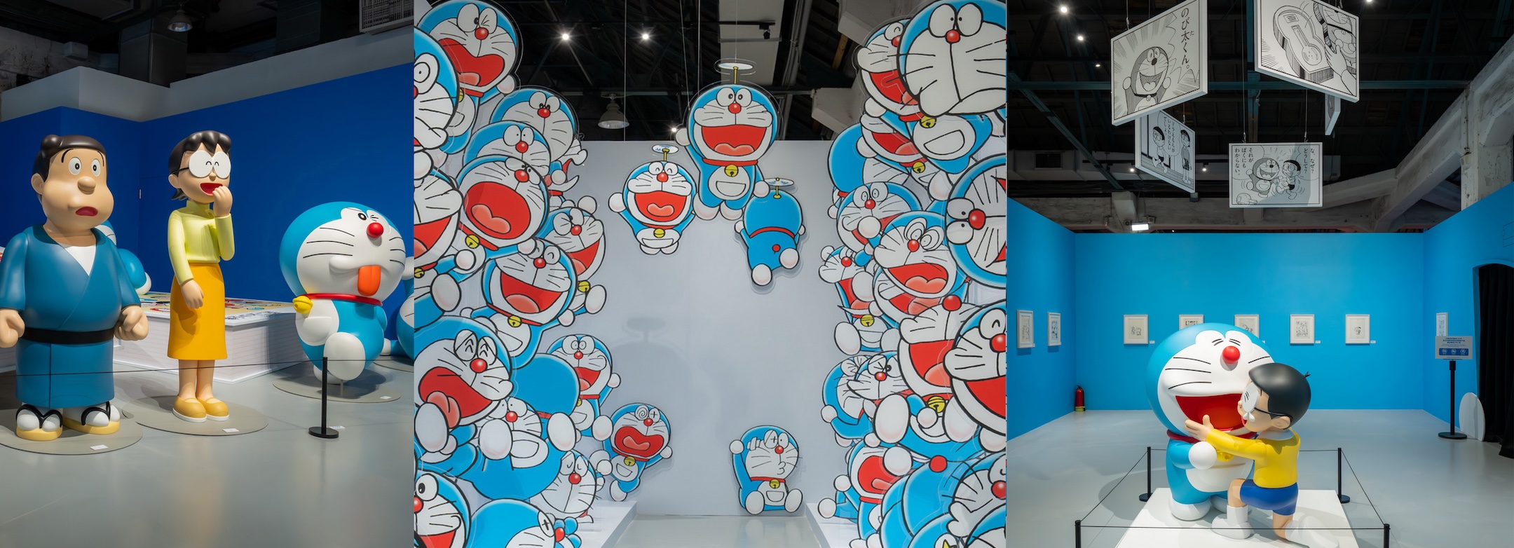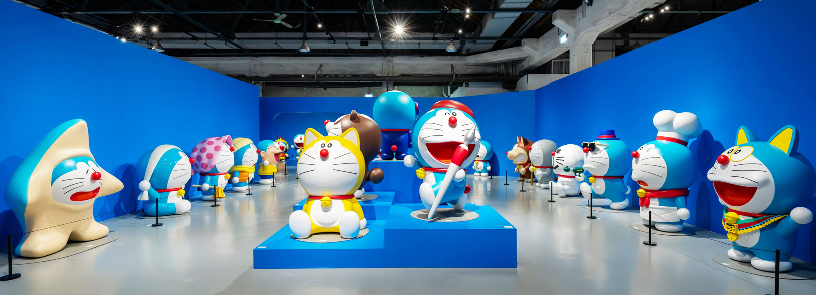 場館以亮藍、白與紅色為主調,串連不同情境章節,從經典場景、角色群像到多造型哆啦A夢區,皆以放大物件與高對比背景強化視覺節奏。