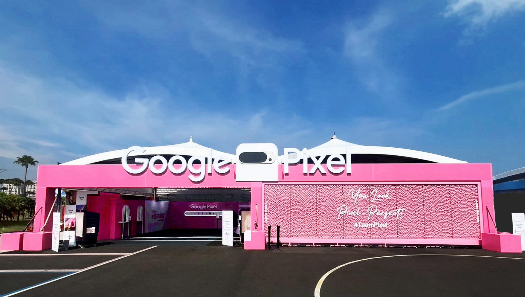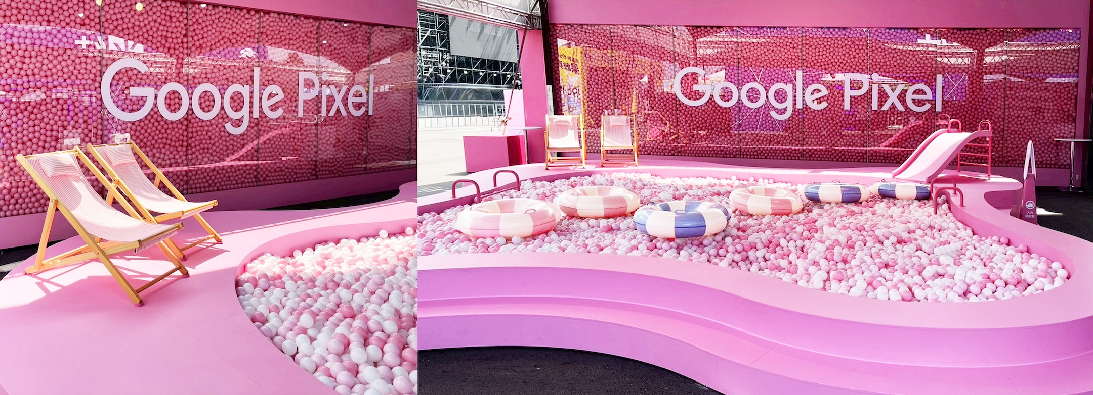 以粉色系視覺與品牌識別為核心語彙,構築出一座能「被參與、被拍攝、而被重新生成」的城市快閃場域;大尺度粉色建築量體以幾何框架與巨型鏡面裝置重塑街區輪廓,入口以 Pixel 鏡框、粉色拱形結構與高密度球池牆面串接節慶氛圍,使整個空間如同一個等待被攝影解鎖的影像劇場。