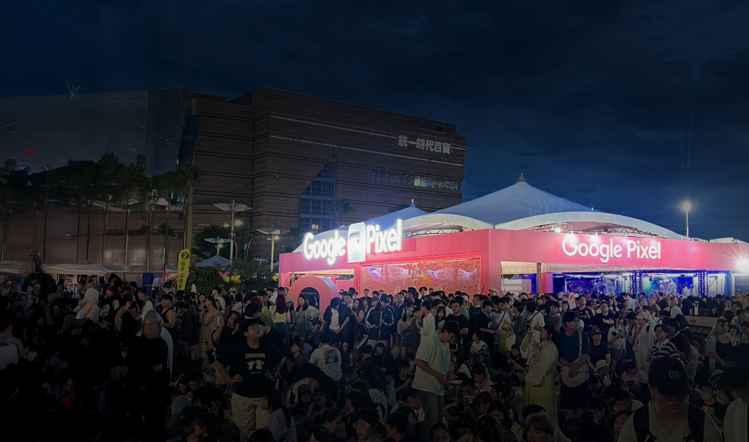 展區以粉霧漸層、圓角語彙與高明度色塊建立連續動線,從外圍的自拍框景、品牌巨型字牆、粉嫩休憩區到主體球池舞台,每個區域皆以最直覺的方式讓參與者擺拍、遊玩、探索;夜幕降臨後,光線在球池與建築表面形成柔亮反射,與大量聚集的人潮構成如浪潮般的社群景觀,使空間不僅是一座品牌快閃店,而是由所有拍攝者共同創造、共同詮釋、共同擴散的流動影像場域。