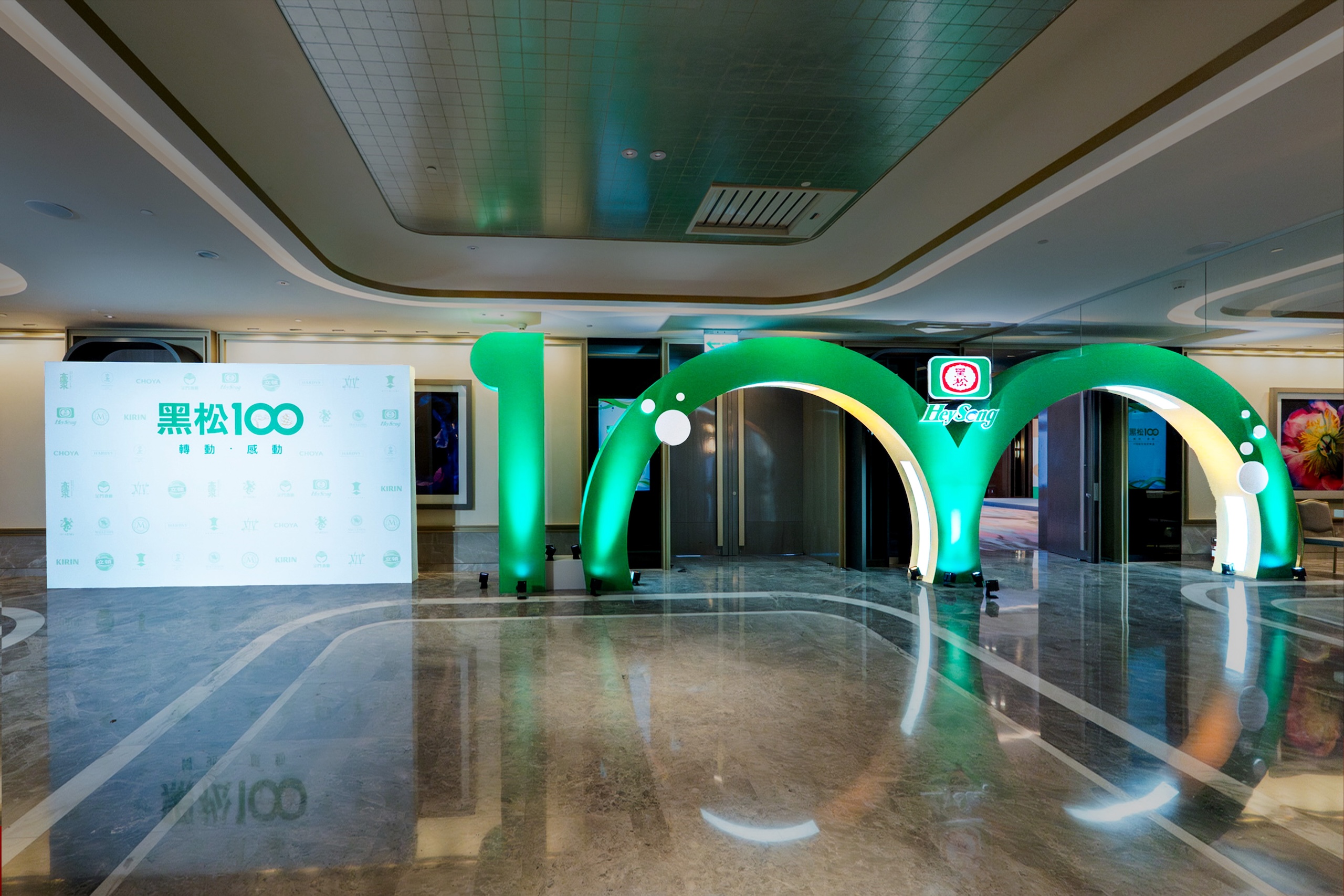 以「轉動.感動」為核心語彙,我們重新詮釋黑松百年品牌的前進軌跡。入口以「100」造型弧拱開啟動線,如同時間的圓周不斷向前;綠色光帶自內部向外延展,象徵黑松從 1925 年至今,始終陪伴台灣生活的流動暖度。