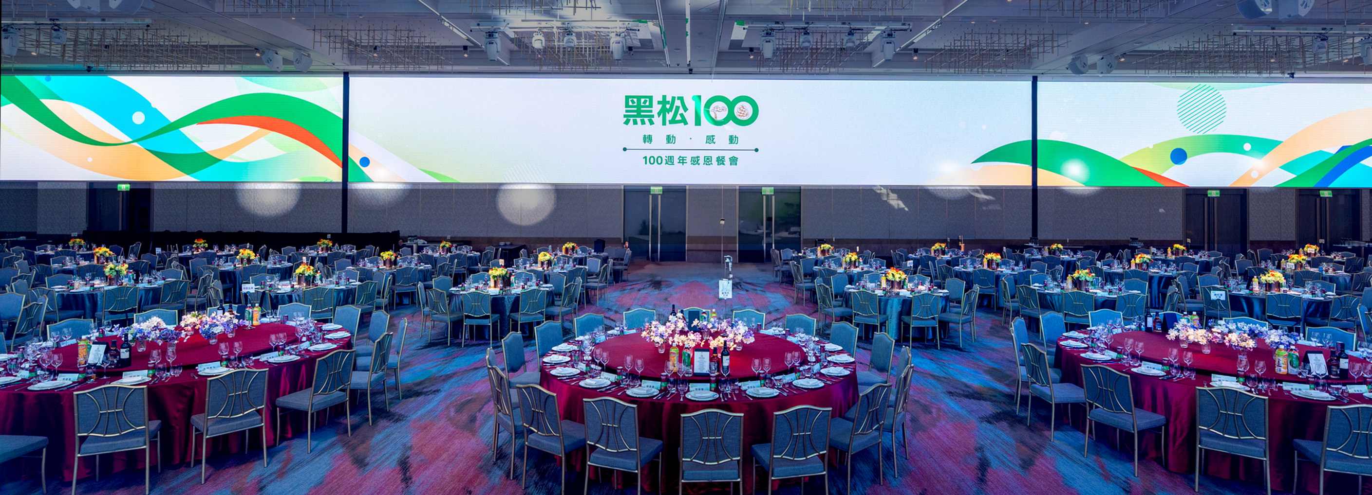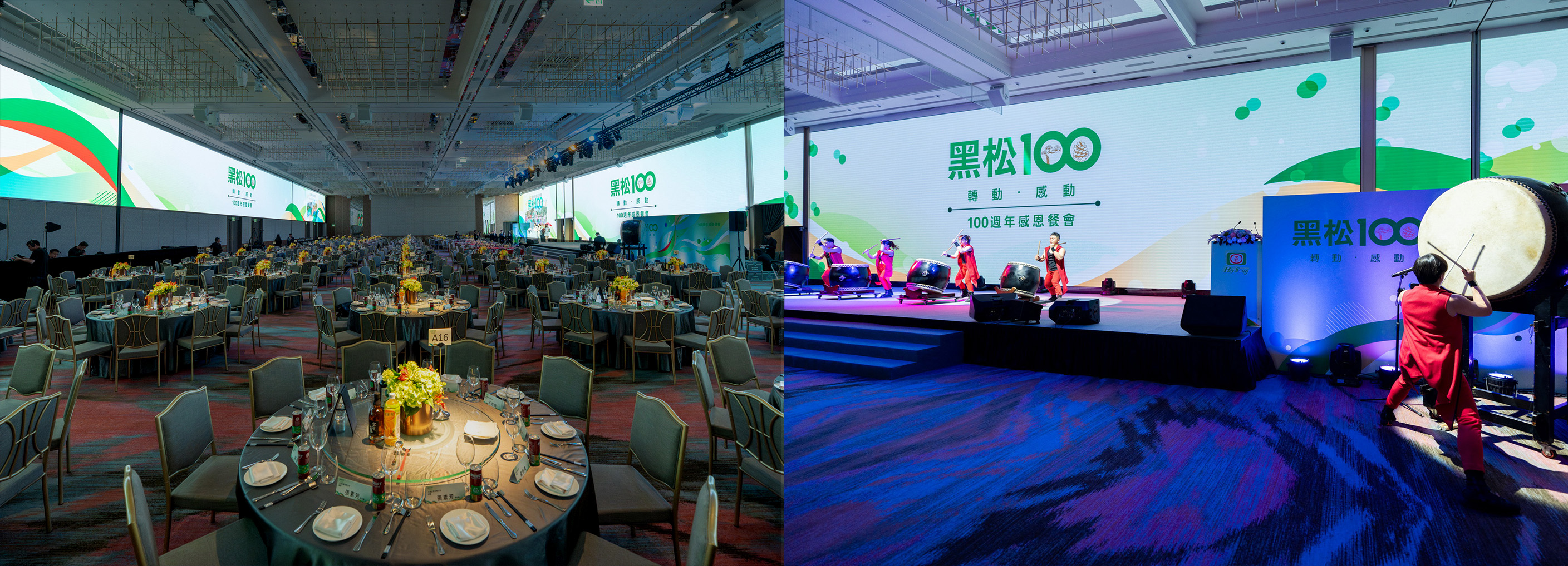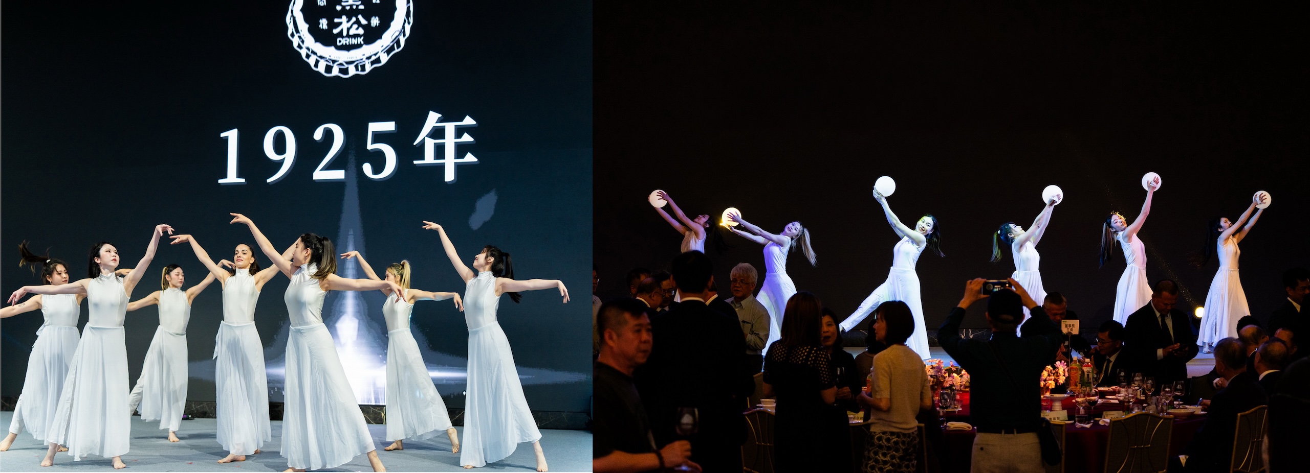 桌面佈置以低彩花藝搭配金色燈盞延續感恩主題,而鼓陣、現代舞、舞者群像等演出則以身體的節奏體現「動」的精神,讓整場餐會從品牌故事推進至真實的情感感動。整體設計以典雅、節奏與情感為結構,將黑松百年「轉動成就、感動延續」的精神完整轉化為一場被看見、被記住的品牌里程碑。