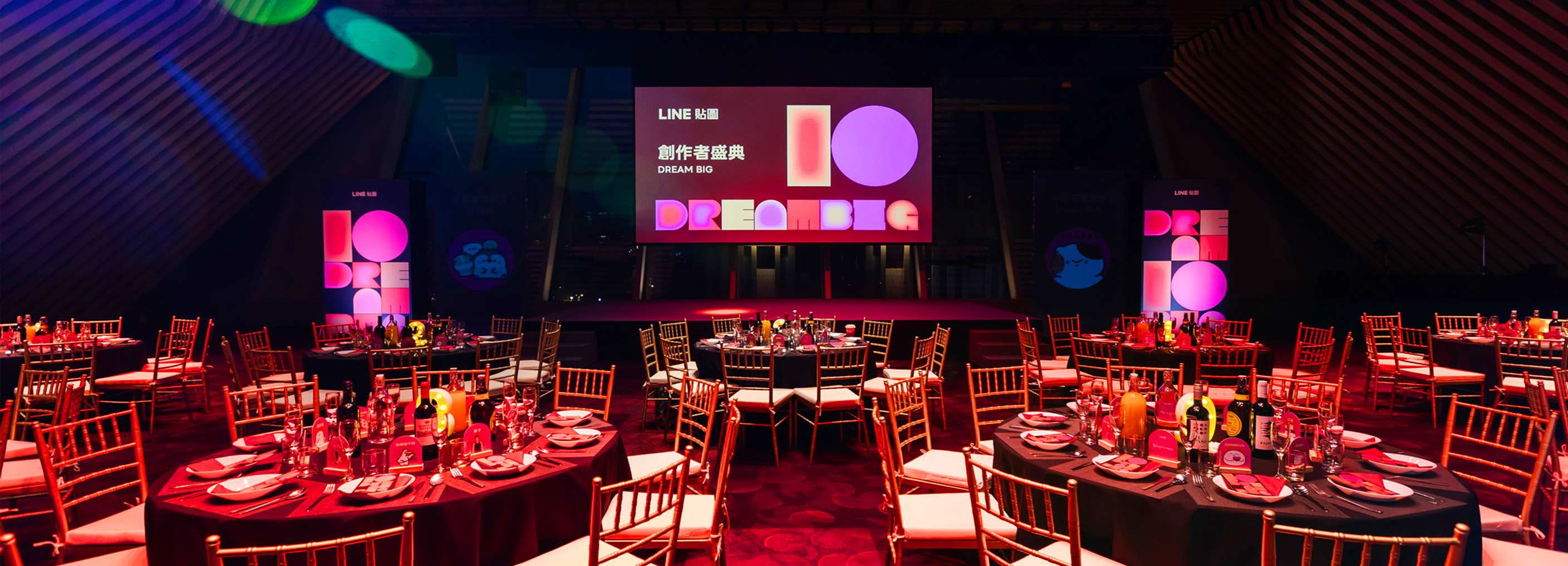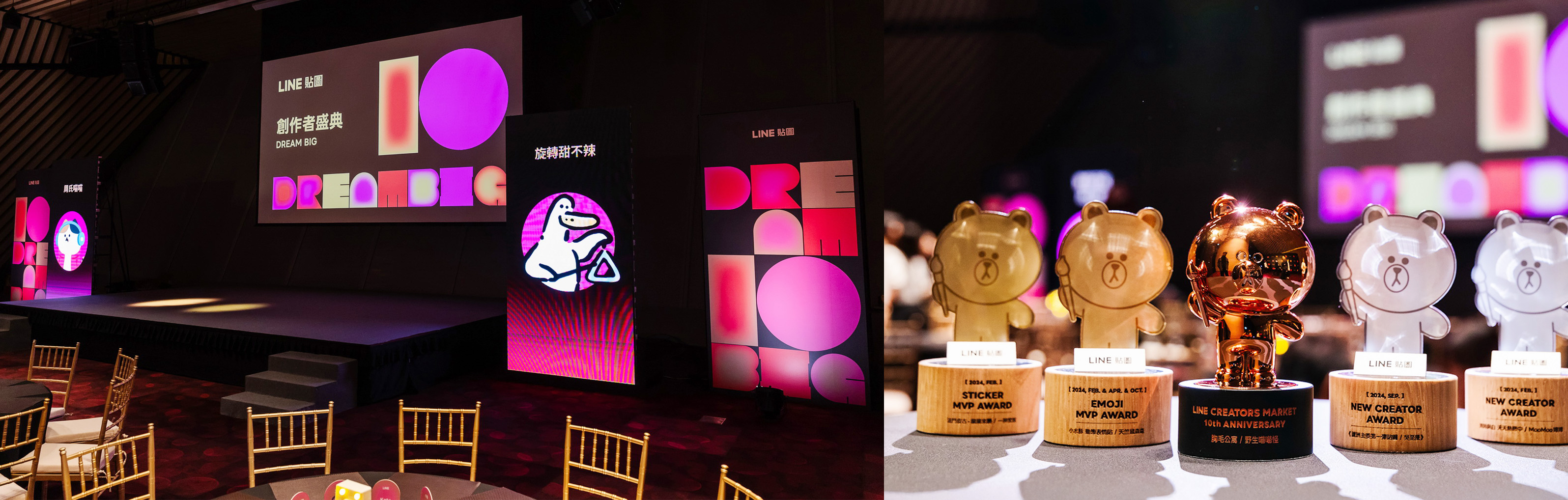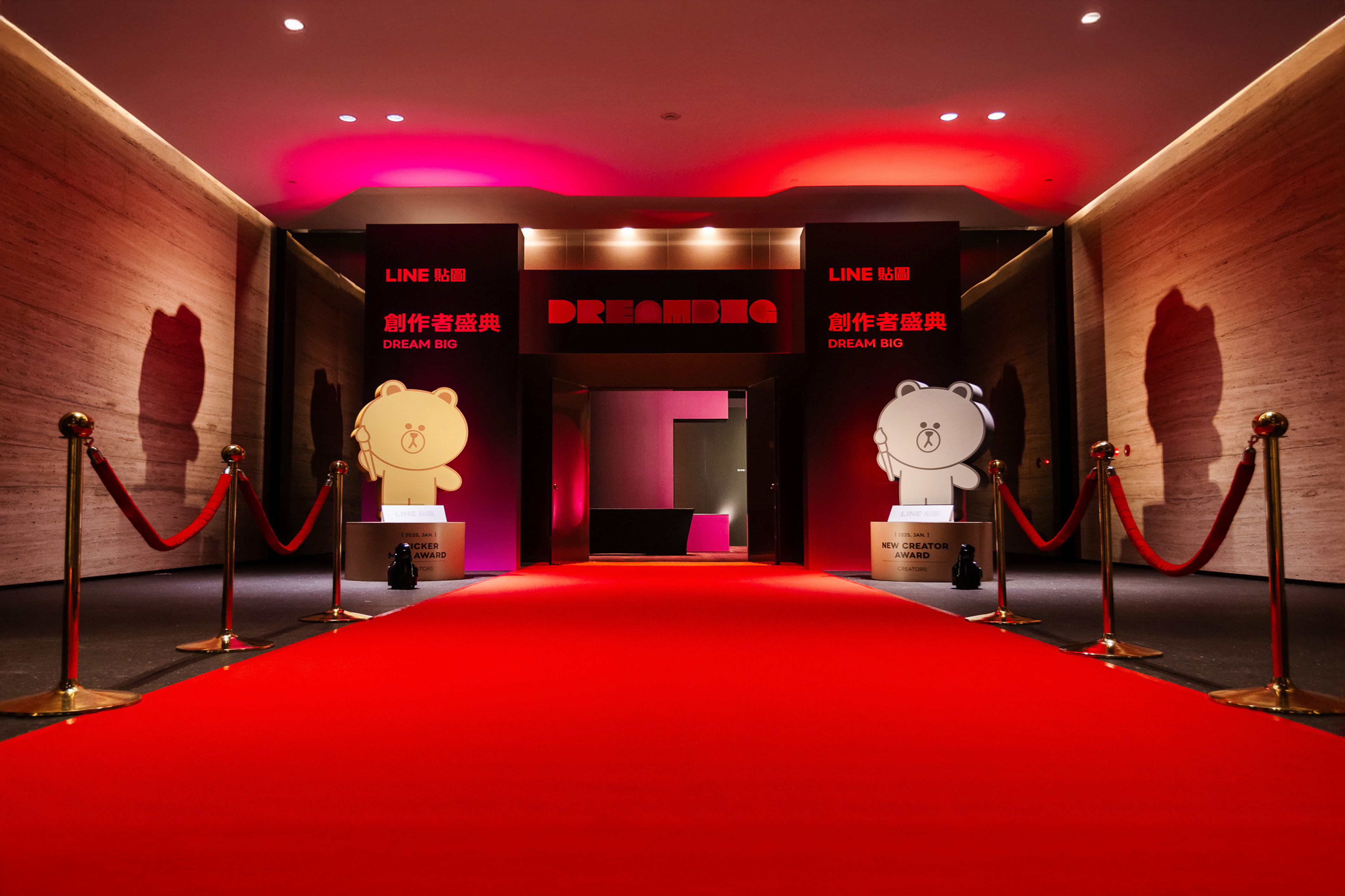 在這場為創作者打造的年終盛會中,我們將 LINE 貼圖世界的豐富情感與互動力,轉化為一場有形的情境裝置。空間以柔和的霧面色調為基底,並透過貼圖角色放大的圖像構成牆面節點,打造「貼圖從螢幕走入現實」的視覺跳脫。