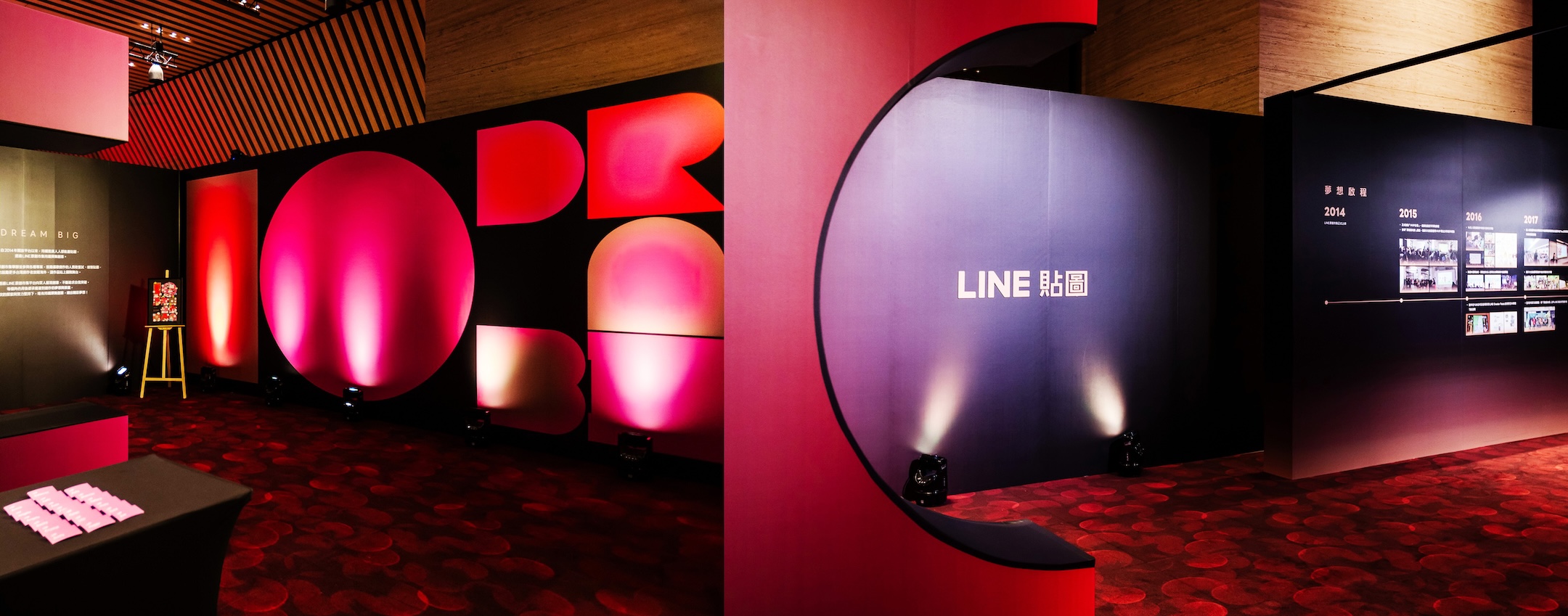 中央流線舞台猶如貼圖的動作軌跡,以弧線光束引導來賓穿越互動環節:從創作理念展示、人氣貼圖實況直播,到即時貼圖體驗區。