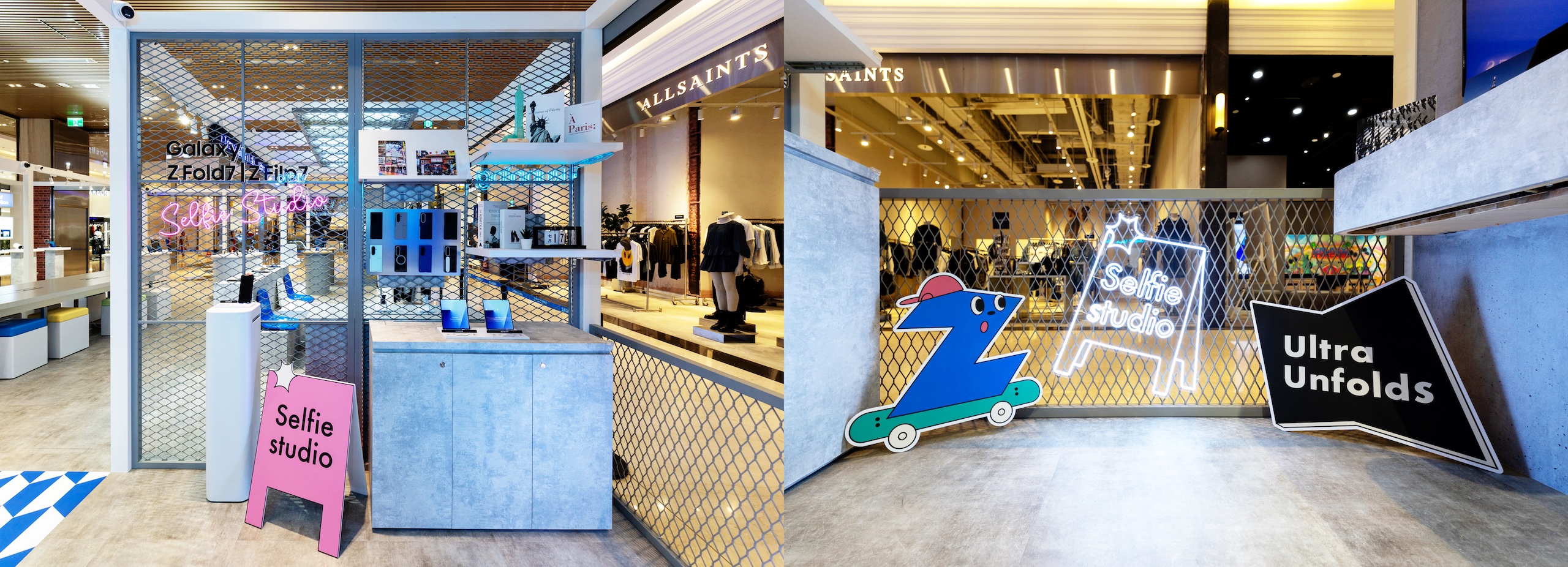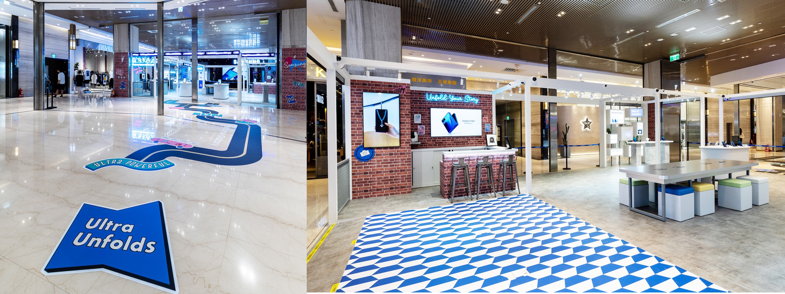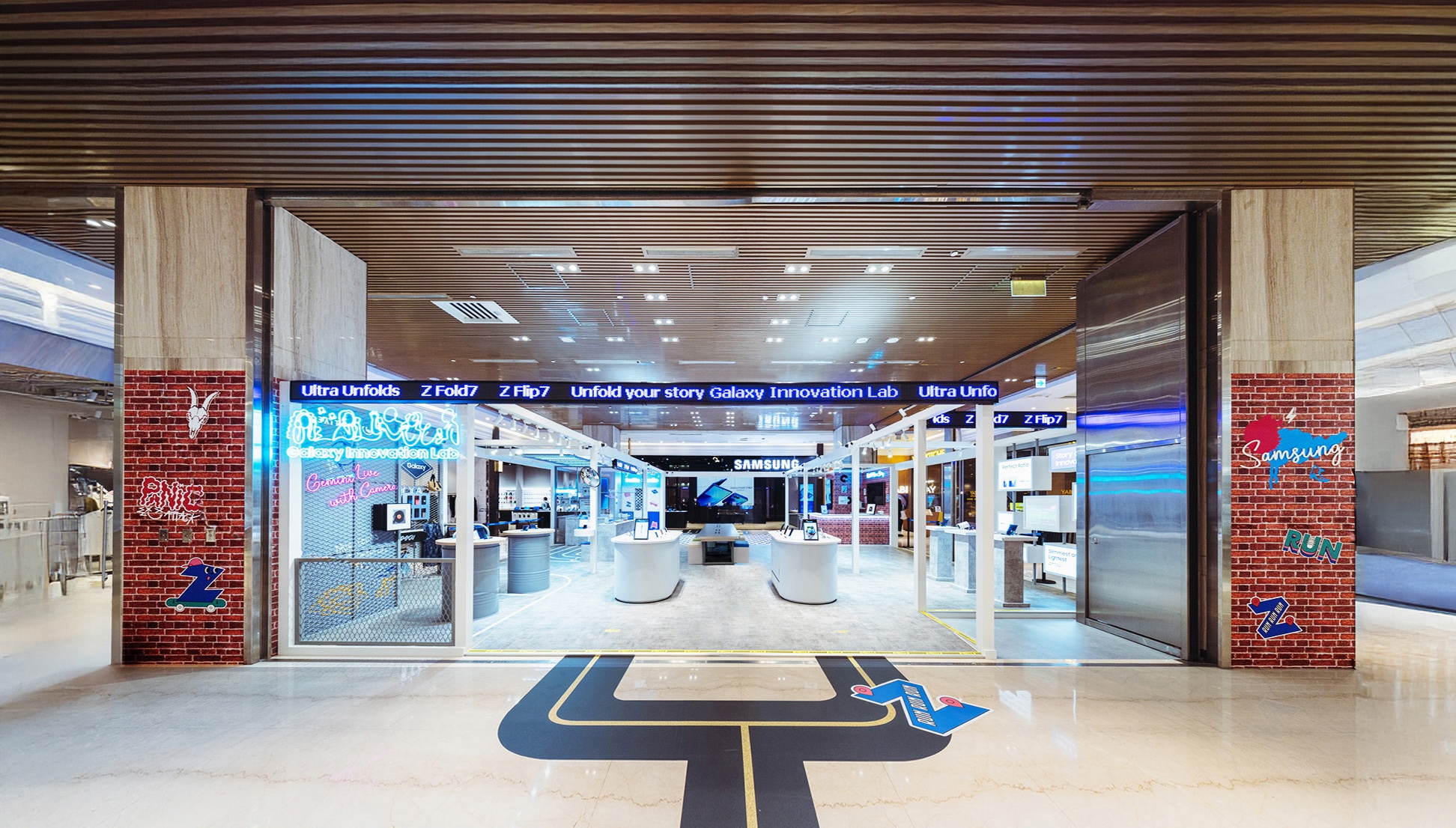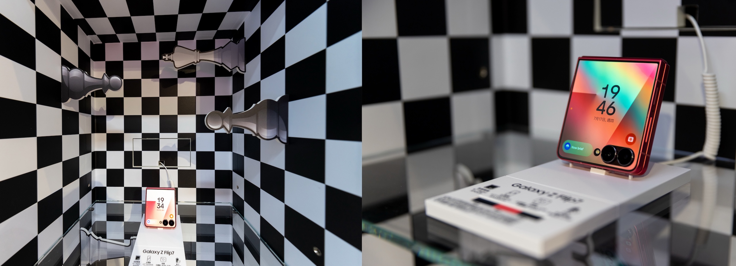 Z Fold 與 Z Flip 系列分置於不同主題之中,以強烈透視錯位的黑白棋盤室展現摺疊影像的獨特角度,並以金屬與混凝土質地的展示桌構成「創作者工作台」,讓產品細節轉化為空間語彙。