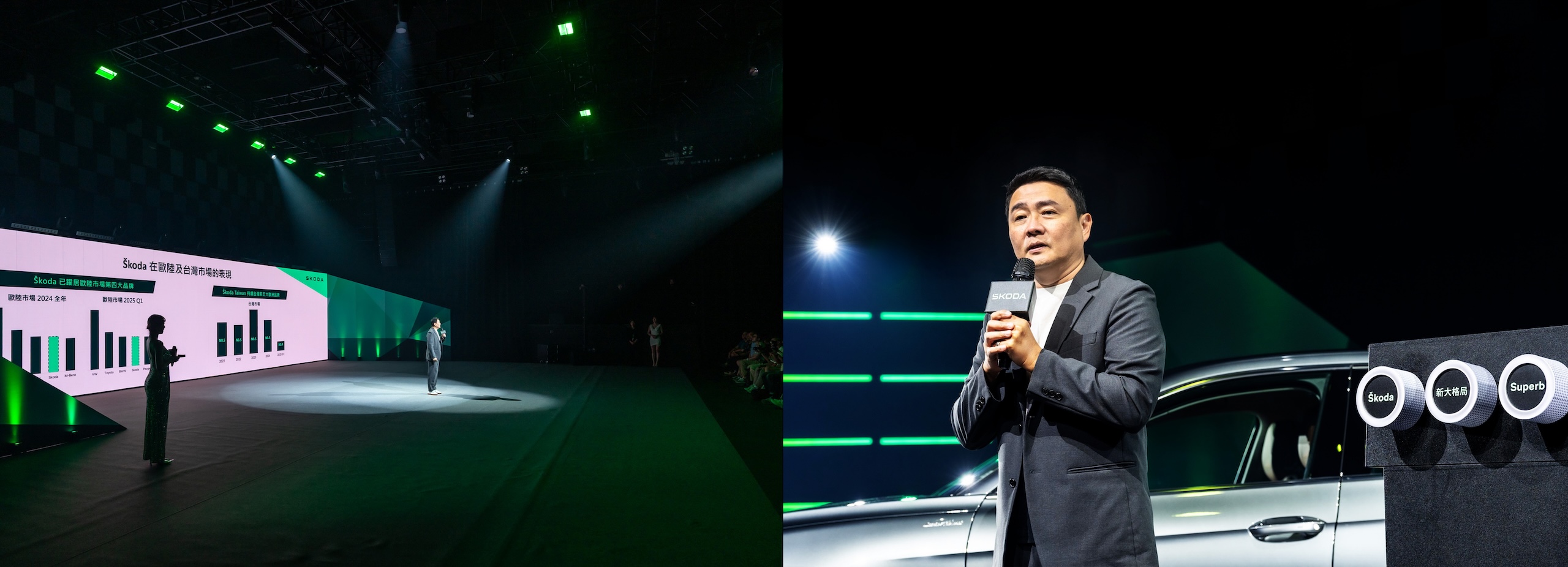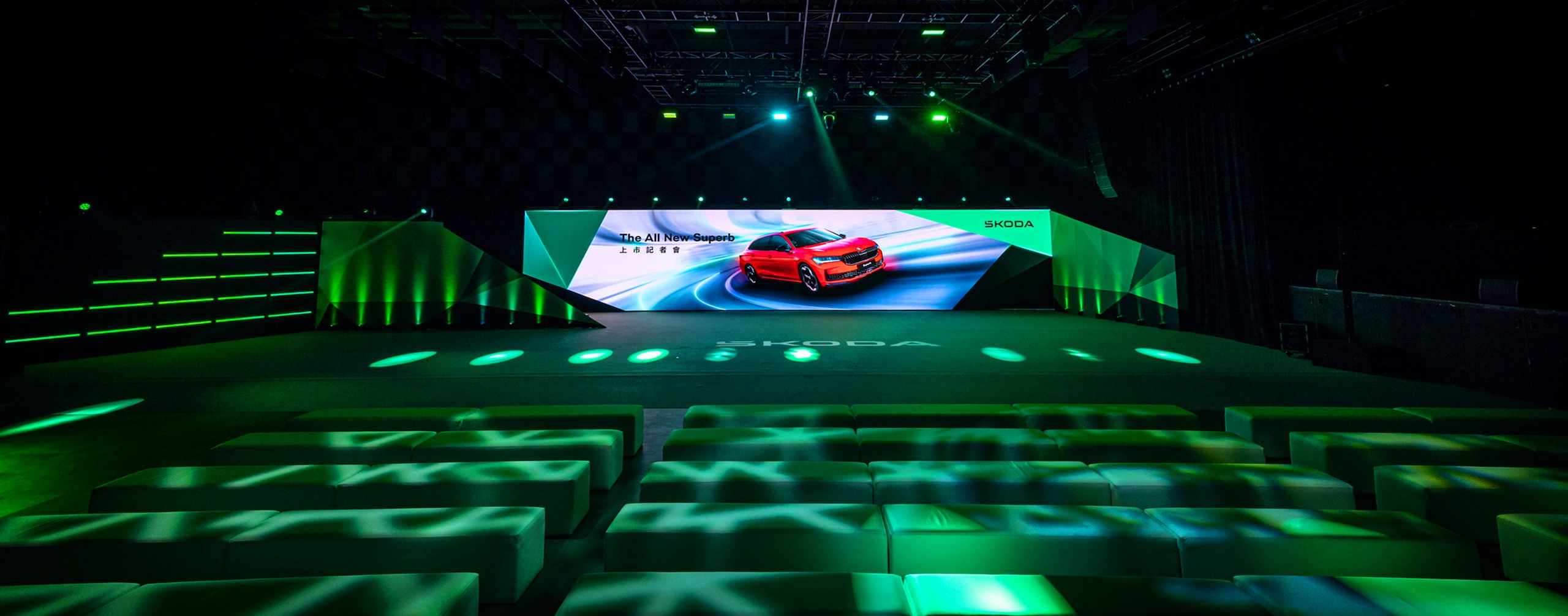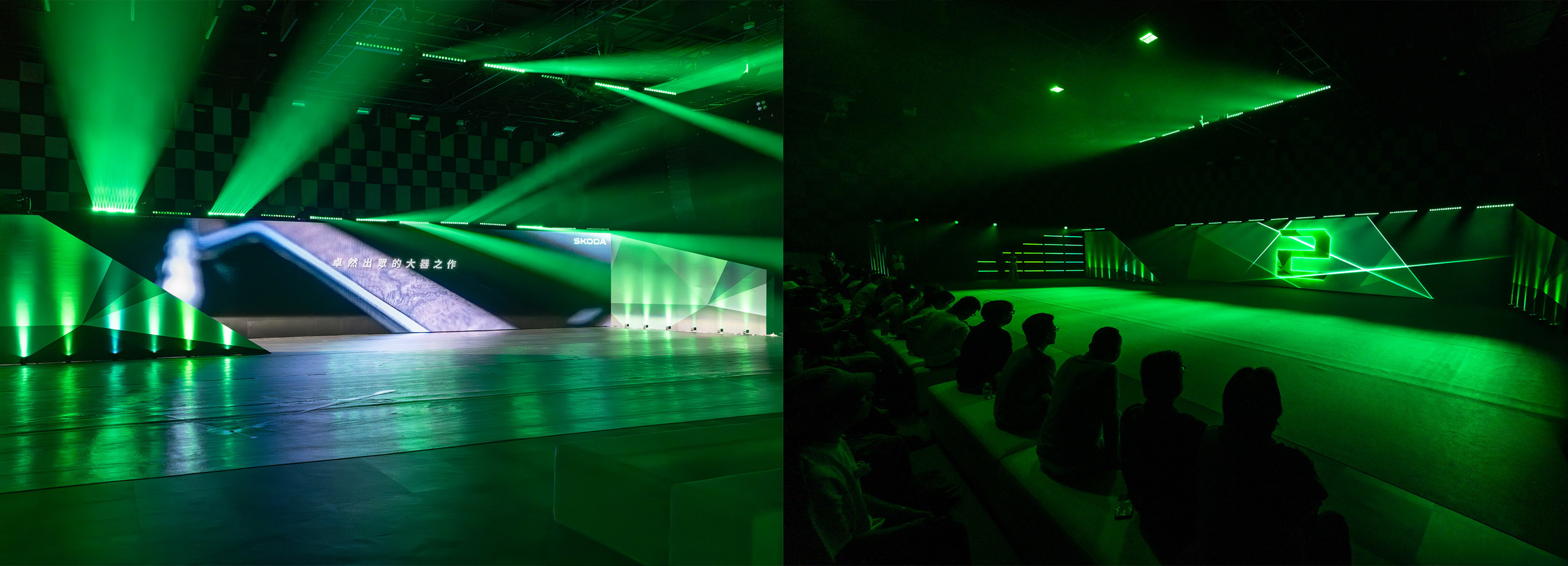 觀眾席以低檯度白色平台打造沉浸視角,讓所有視線自然導向中央跑道;光影流動則以品牌綠的不同層次拉出節奏,從倒數、影片到車輛進場皆環環相扣。整體敘事從品牌願景、科技語彙到車型亮點,以大格局且俐落的空間語言完成一場兼具速度感與當代質感的上市發表。